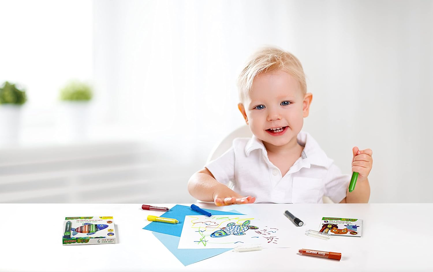 El estuche de ceras Alpino Baby PX002006 incluye 6 ceras en barra diseñadas especialmente para los más pequeños. Estas ceras son ideales para fomentar la creatividad y el desarrollo psicomotor de los niños. Son fáciles de usar, limpias y superlavables, lo que las hace perfectas para el uso infantil.